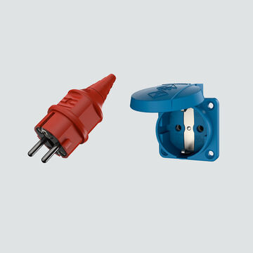 Nuestras bases semiempotrables SCHUKO® con símbolo de martillo también se suministran con collarín de estanqueidad de la brida de elastómero termoplástico (TPE) para equipos móviles, imperdibles gracias a la tecnología de dos componentes y opcionalmente con bornes roscados o enchufables. Con la tapa abatible cerrada, estos tomacorrientes cumplen el tipo de protección IP54 en cualquier posición. Las soluciones son seguras contra contactos de los dedos y el dorso de la mano según la norma DIN EN/IEC 60529, también se suministran con medida de la brida de 75 x 75 mm para conductos de cables y cajas UP – y, si lo desea, puede reequipar fácilmente los tomacorrientes SCHUKO® utilizados hasta ahora y convertirlos en estos tomacorrientes.
